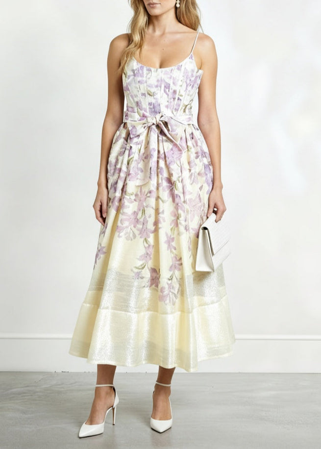 The Elowen Midi dress features delicate lavender flowers that bring a fresh, feminine touch to your look. Its corset top shapes and supports your silhouette, while the waist tie allows you to customize the fit for added elegance.