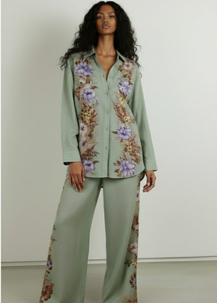 Elevate your wardrobe with the Felicity Set, a light and airy blouse and pant combination adorned with delicate floral details. Perfect for warm days, this set offers breathable comfort while adding a touch of elegance to your look