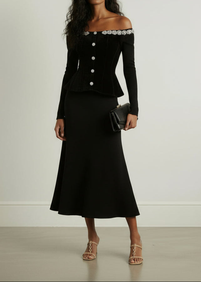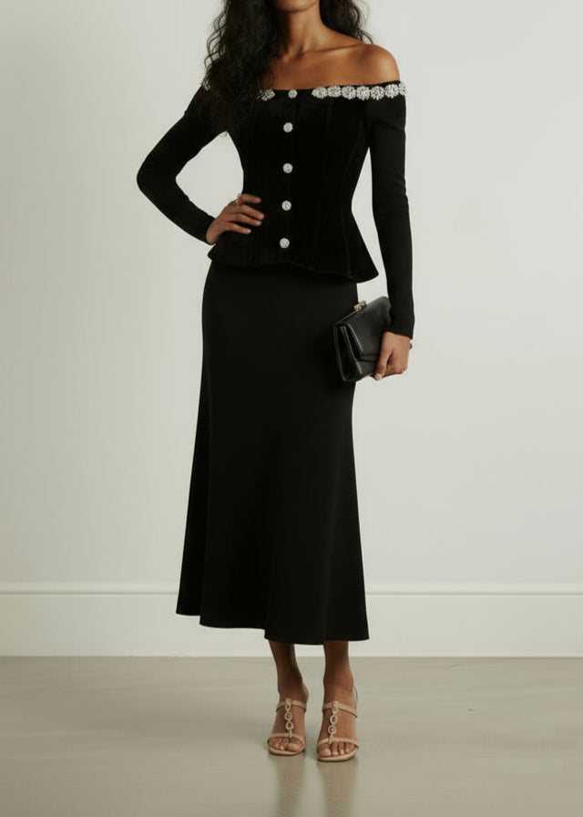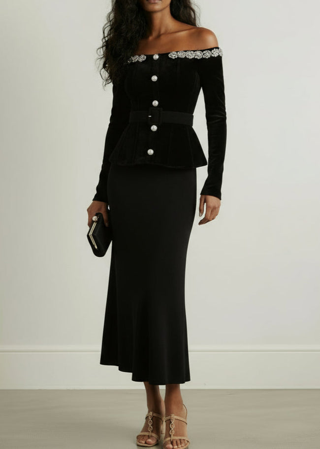 Thee Marina Midi, a sophisticated velvet dress featuring an elegant off-shoulder design and a defined belt that accentuates the waist. Its midi length offers timeless grace, perfect for formal occasions or refined evenings. The sumptuous fabric and tailored fit combine comfort with style for a truly captivating look.