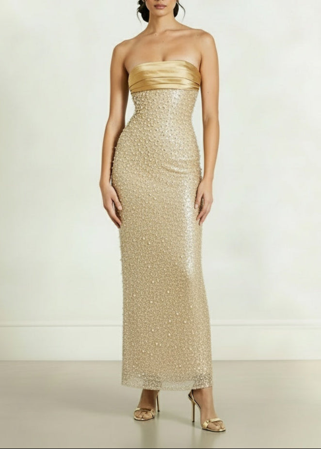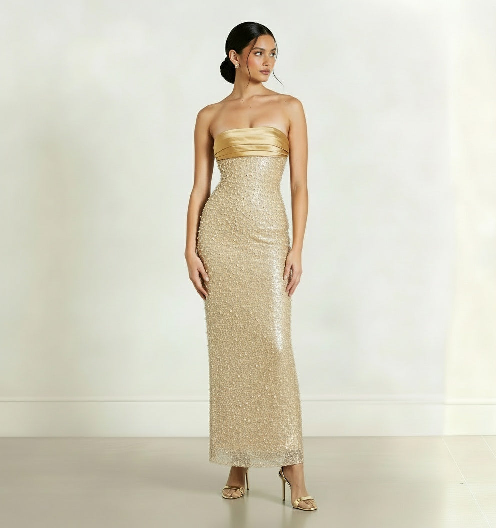 Elevate your wardrobe with the Roxy Midi, a sophisticated midi dress adorned with exquisite gold embellishments. Its elegant design offers a refined silhouette perfect for special occasions, combining timeless style with a touch of glamour.