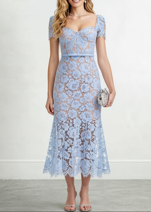The Tara Midi is an elegant blue lace dress designed for special occasions. Its delicate lace fabric offers a refined texture, while the midi length provides a sophisticated silhouette suitable for formal events. This dress combines timeless style with subtle detailing, making it a standout choice for those seeking polished and graceful occasion wear.